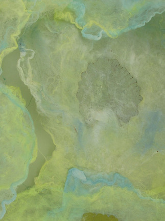One of my favourite summer pastimes is lying under a tree, looking up through a canopy of leaves at a blue summer sky dotted with a few fluffy white clouds. In this work I want to evoke a sensation of dreaming, of drifting and weightlessness- the feeling that you are looking up through the leaves at the clouds- but also that you are floating in the clouds looking back down at yourself. I combined the silk fusion technique with actual leaves from my garden. It seems strangely fitting that each silk mawata square is the product of one cocoon produced by one silkworm from the leaves of the mulberry tree. My palette of lemon yellows and turquoise blues is an attempt to capture the sensation of the shimmering and reflections of the leaves, light, sky, air and clouds.